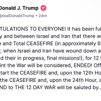 "It has been fully agreed by and between Israel and Iran that there will be a Complete and Total CEASEFIRE (in approximately 6 hours from now, when Israel and Iran have wound down and completed their in progress, final missions!), for 12 hours, at which point the War will be considered, ENDED!" Trump wrote on Truth Social. "Officially, Iran will start the CEASEFIRE and, upon the 12th Hour, Israel will start the CEASEFIRE and, upon the 24th Hour, an Official END to THE 12 DAY WAR will be saluted by the World. During each CEASEFIRE, the other side will remain PEACEFUL and RESPECTFUL."
