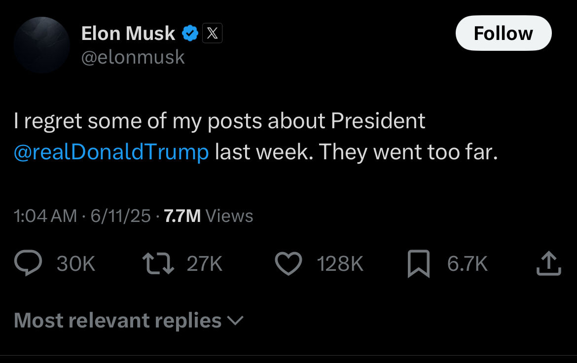 Elon Musk blinked. After a week of going scorched-earth on Donald Trump—including a now-deleted Epstein post and an impeachment call—Musk is suddenly backpedaling. In a post this morning, he said his Trump attacks “went too far” and admits he regrets them.